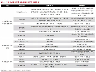 2、技術(shù)平臺:DNA閱讀、寫作和編輯技術(shù)的不斷進步、DNA測序時間和成本的持續(xù)降低等以多種方式驅(qū)動著合成生物學(xué)的發(fā)展,提供賦能技術(shù)型公司顯然是吃香的,如提供基因合成、基因測序和基因編輯等服務(wù)的上市公司。