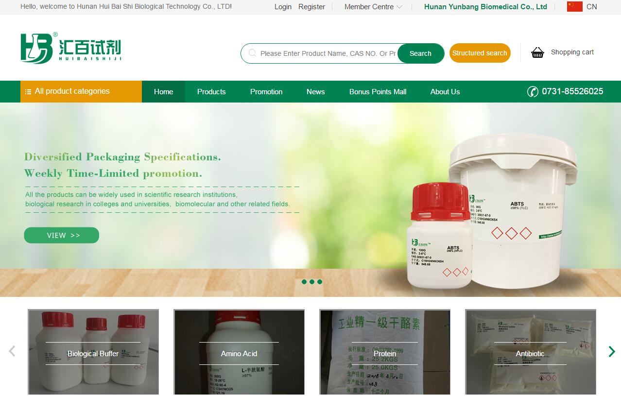 In order to facilitate foreign users to find products more quickly and timely understand the content of industry information, we set up the "Huibai Reagent" mall English station. HuibaiReagent English Station continues to adhere to the principle of "credibility as the basis of enterprise survival", in the home page set up 5 integrated plates, each plate with clear functions, rich content, convenient for you to quickly obtain the products and services you want information.