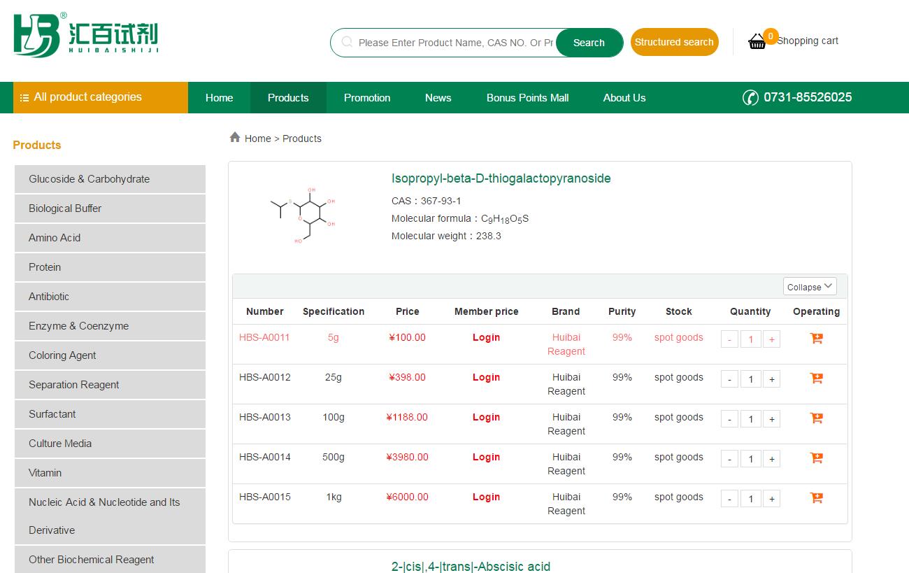 At present, we have thousands of biochemical reagent varieties, according to the different packaging specifications of the product pricing, price display at a glance, users can according to the product name or CAS number for product and commodity price inquiries.